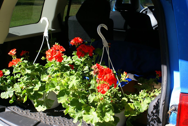 $5 red geranium hanging baskets to replace the tired end of season baskets on the porch.